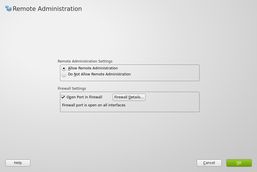 - اگر ضروری است، همچنین تیک Open Port in Firewall را فعال کنید ( برای مثال زمانی که شما واسط شبکه (Network Interface) خو را بر روی ناحیه خارجی (External Zone) تنظیم کرده باشید. اگر شما بیش از یک رابط شبکه دارید، پورتهای باز دیواره آتش ( فایروال ) را توسط جزئیات دیوار آتش (Firewall Details) محدود کنید.